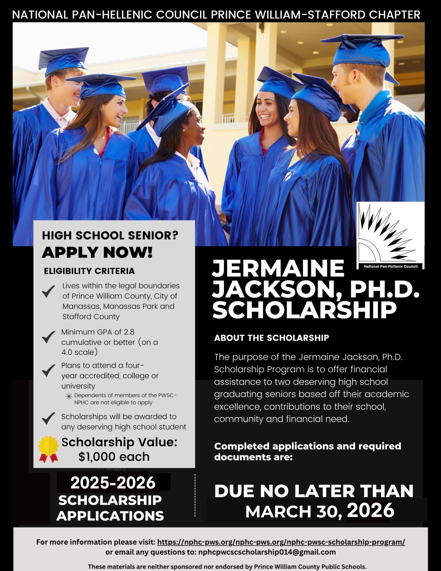 The Jermaine Jackson, Ph.D. Scholarship Program was established in 2021 in honor of the first President of the Prince William and Stafford County of the National Pan-Hellenic Council (PWSC-NPHC). As the Inaugural President of the PWSC-NPHC he ensured the maturity of the council by selecting its initial officers, establishing financial stability, and led community action events that provided quality of life in Prince William and Stafford County residents. Scholarships are awarded to graduating seniors in the Prince William County, Manassas, Manassas Park, and the Stafford schools. The purpose of the scholarship is to offer financial assistance to deserving high school graduating seniors based off their academic excellence, contributions to their school and community and financial need.